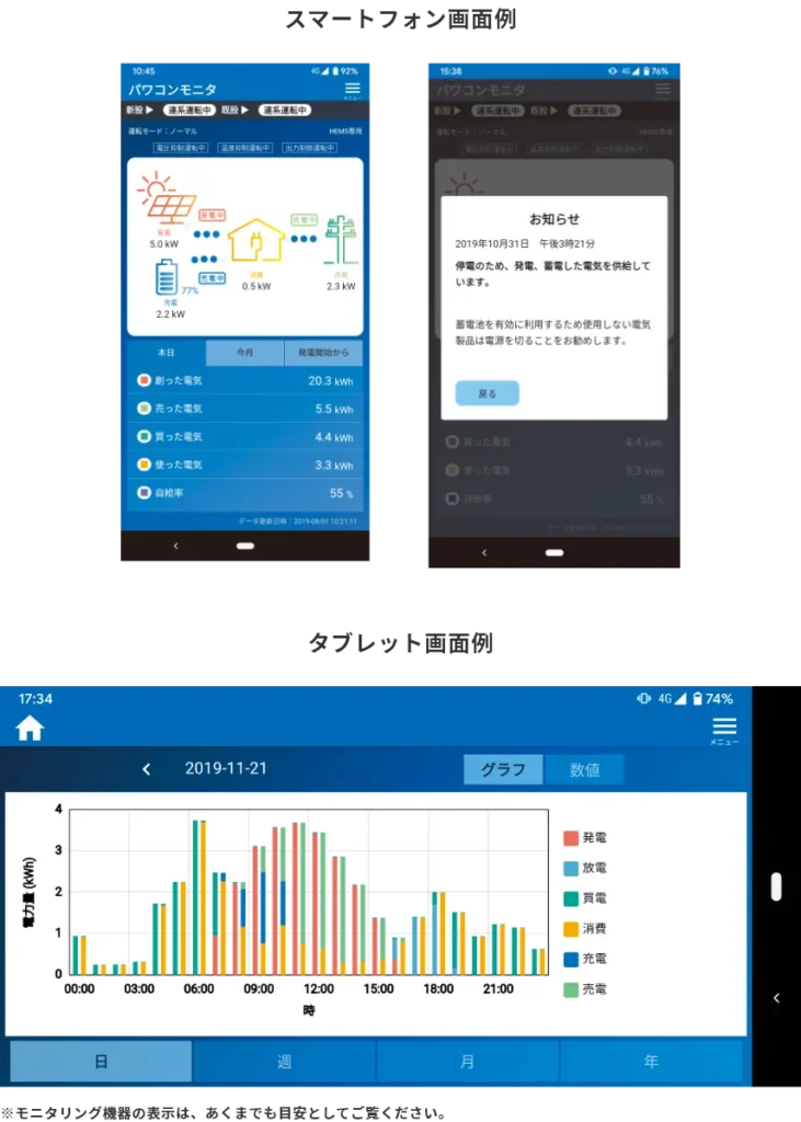 - お知らせ情報の通知や発電実績をグラフと数値で表示して便利(日、週、月、年単位)