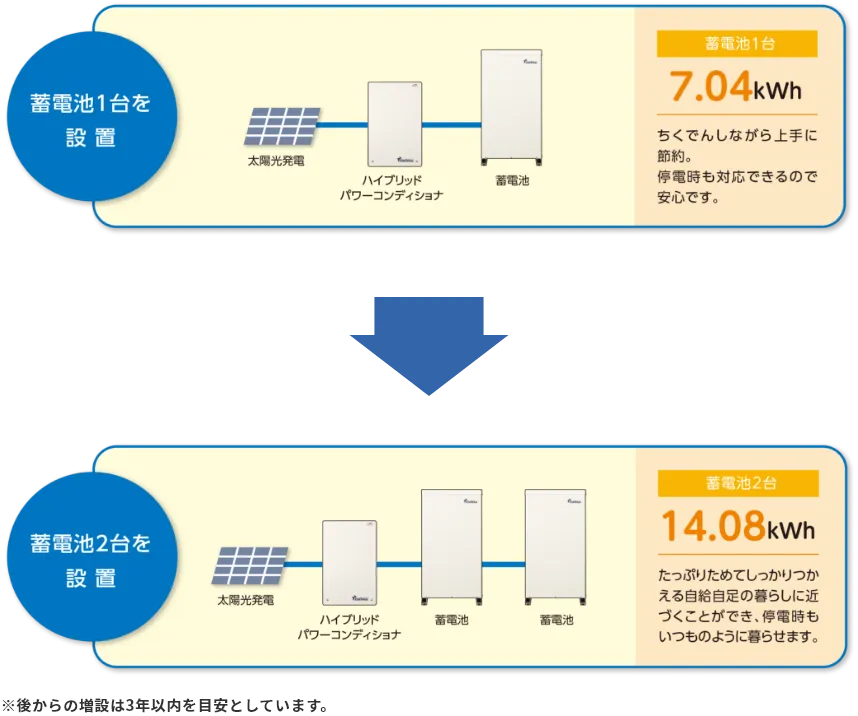 - 2台設置で14.08kWhの大容量でたっぷりためてしっかり使える