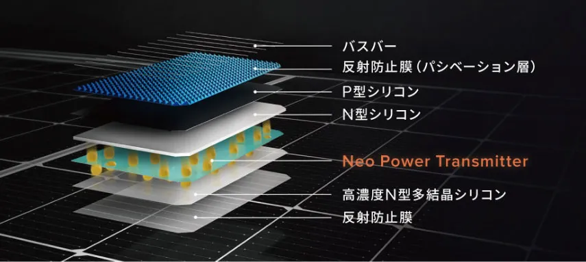 - N型セルでより多くの電子を裏面の電極に到達させ、さらに高出力・高効率を実現