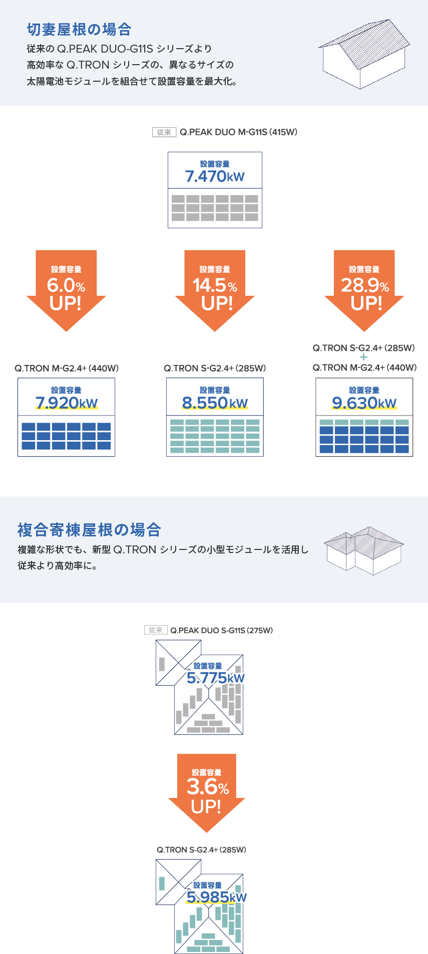 小型であるため、様々な住宅屋根に柔軟に設置できます。なお、屋根の形に合わせてQ.TRON M-G2.4+との混合設置も可能で、より多く発電できます。