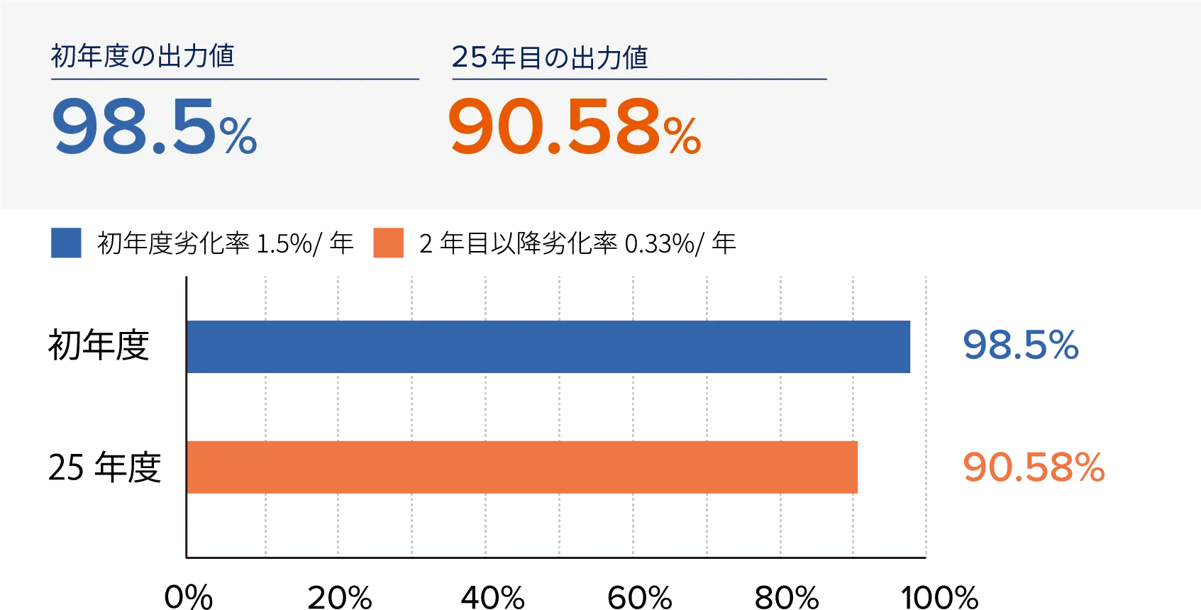 出力保証太陽光パネルの出力性能を、25年もの長期間保証いたします。