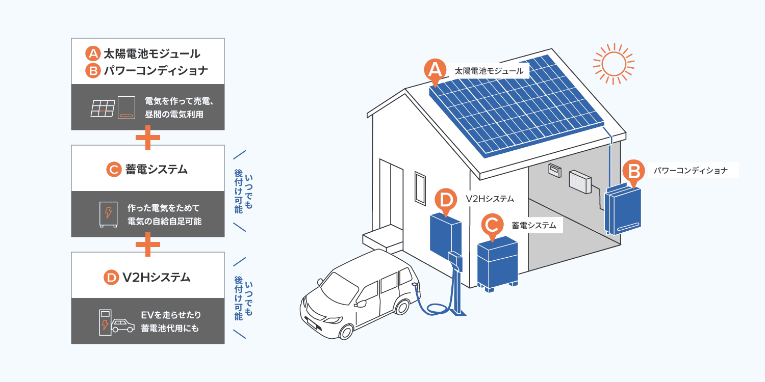 太陽光発電や電力会社からの電気をEV(電気自動車)にため、